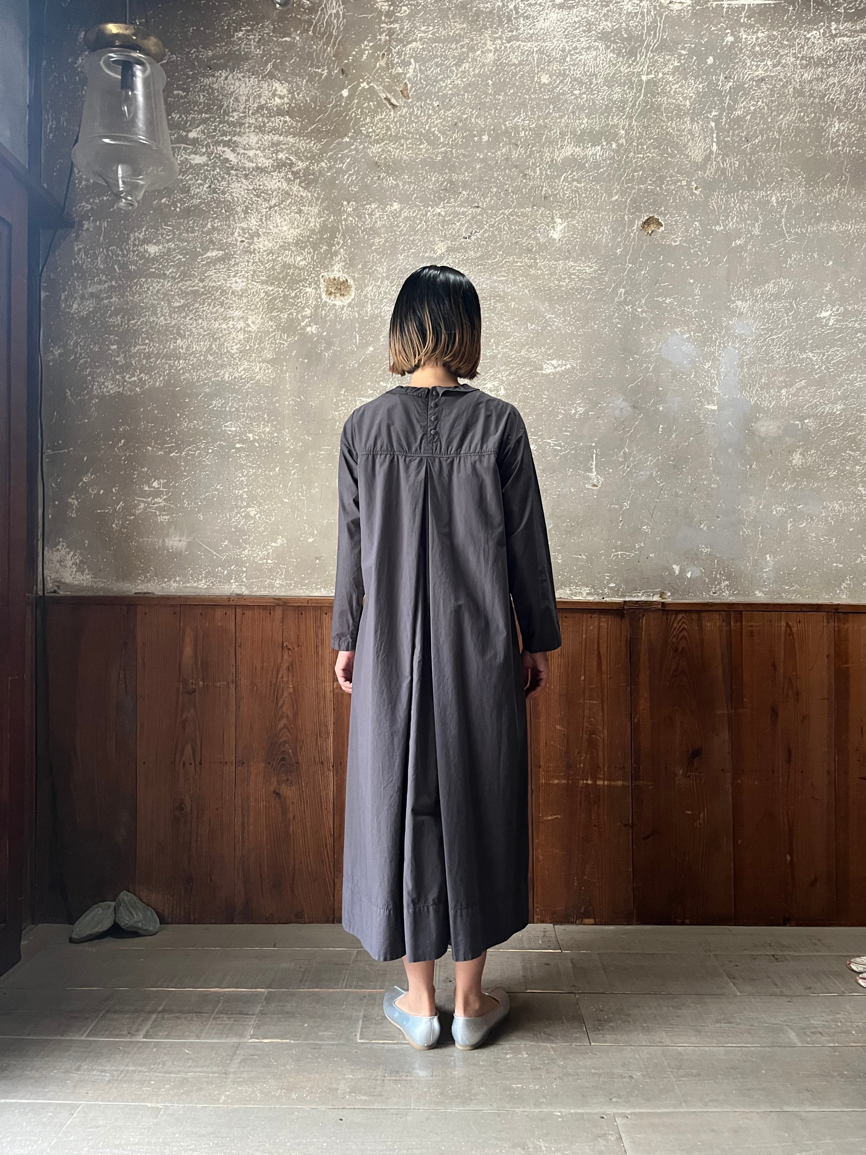 クラシックなフリル襟と前見頃にプリーツのあるドレス。