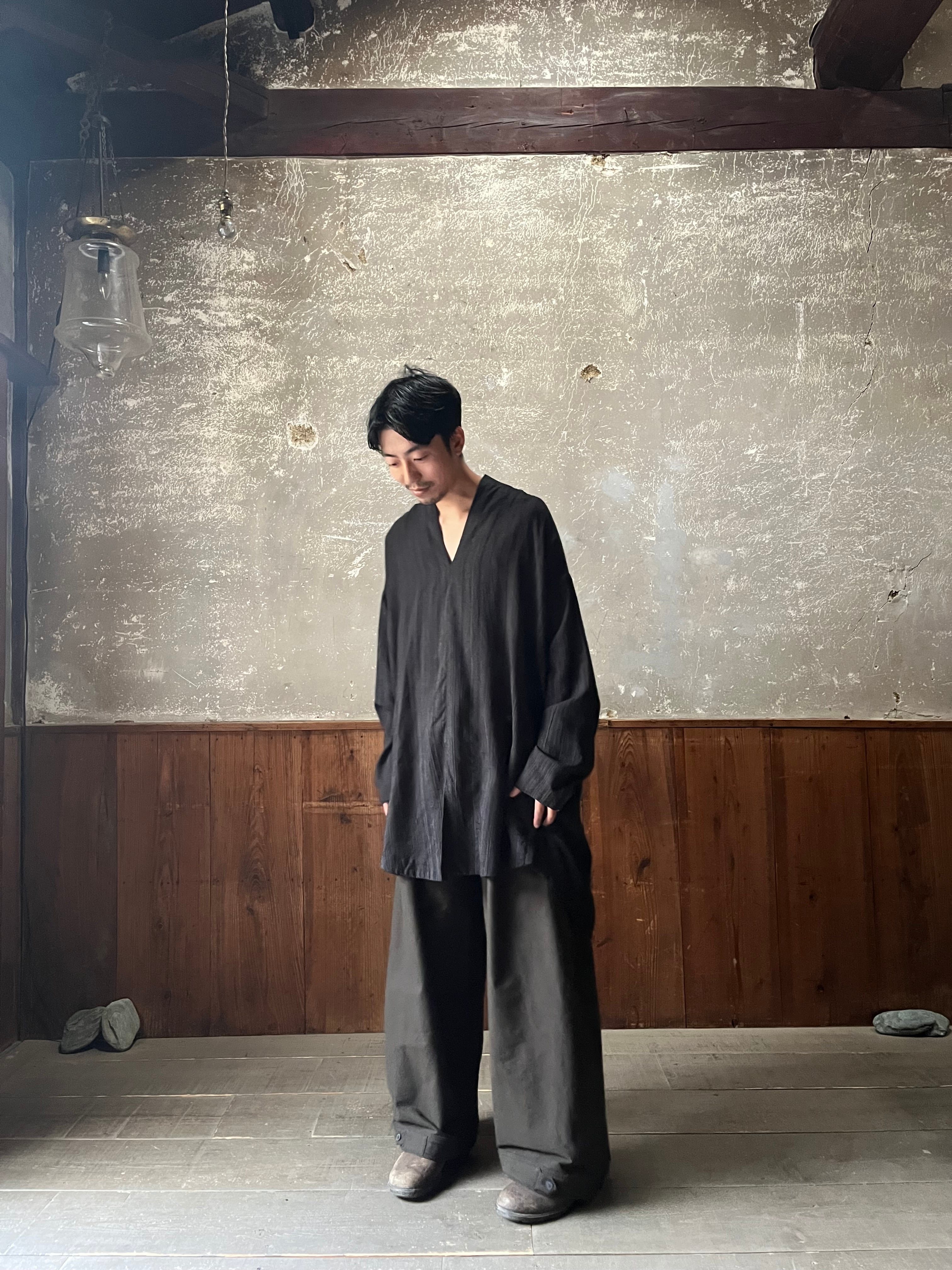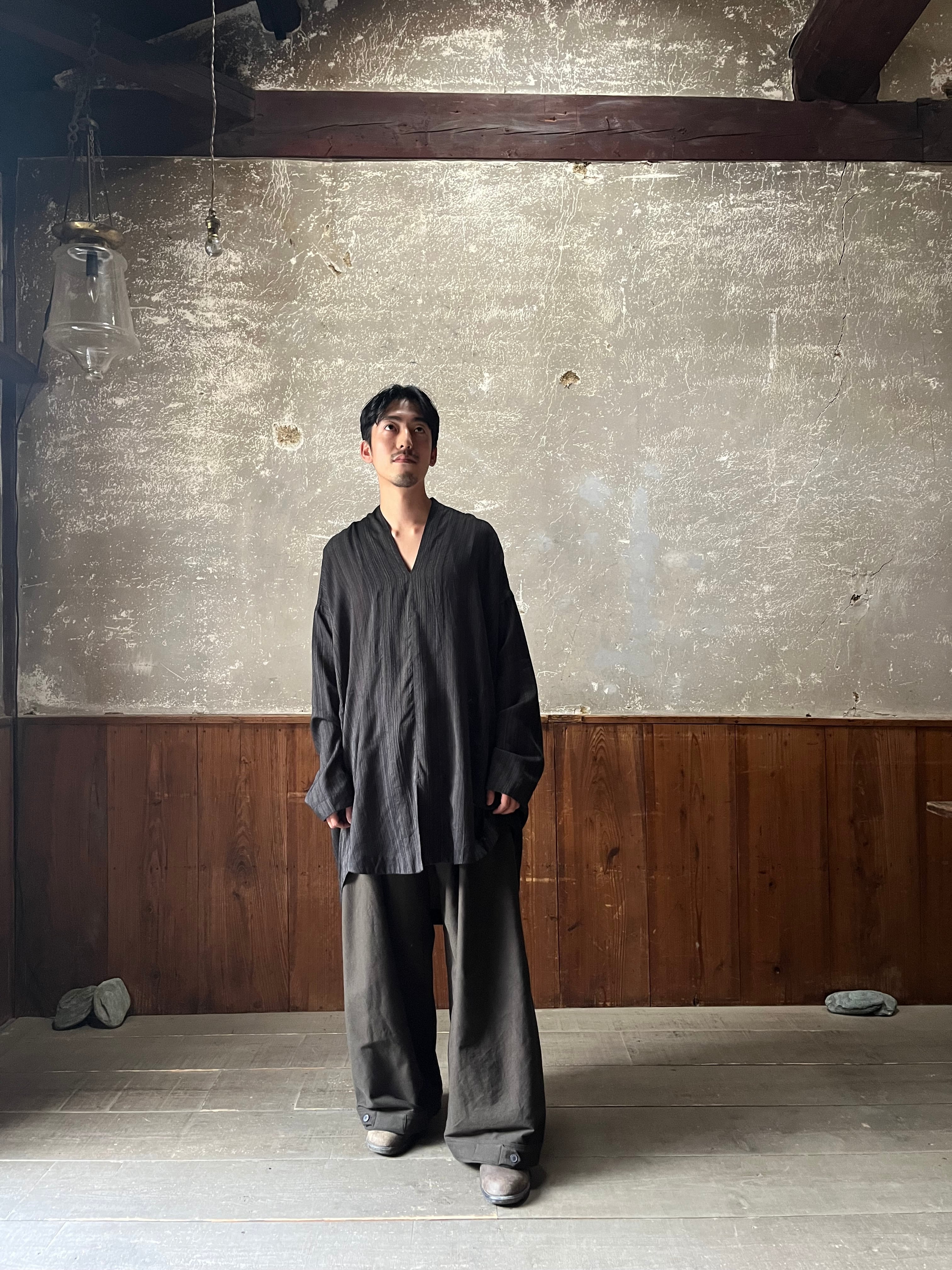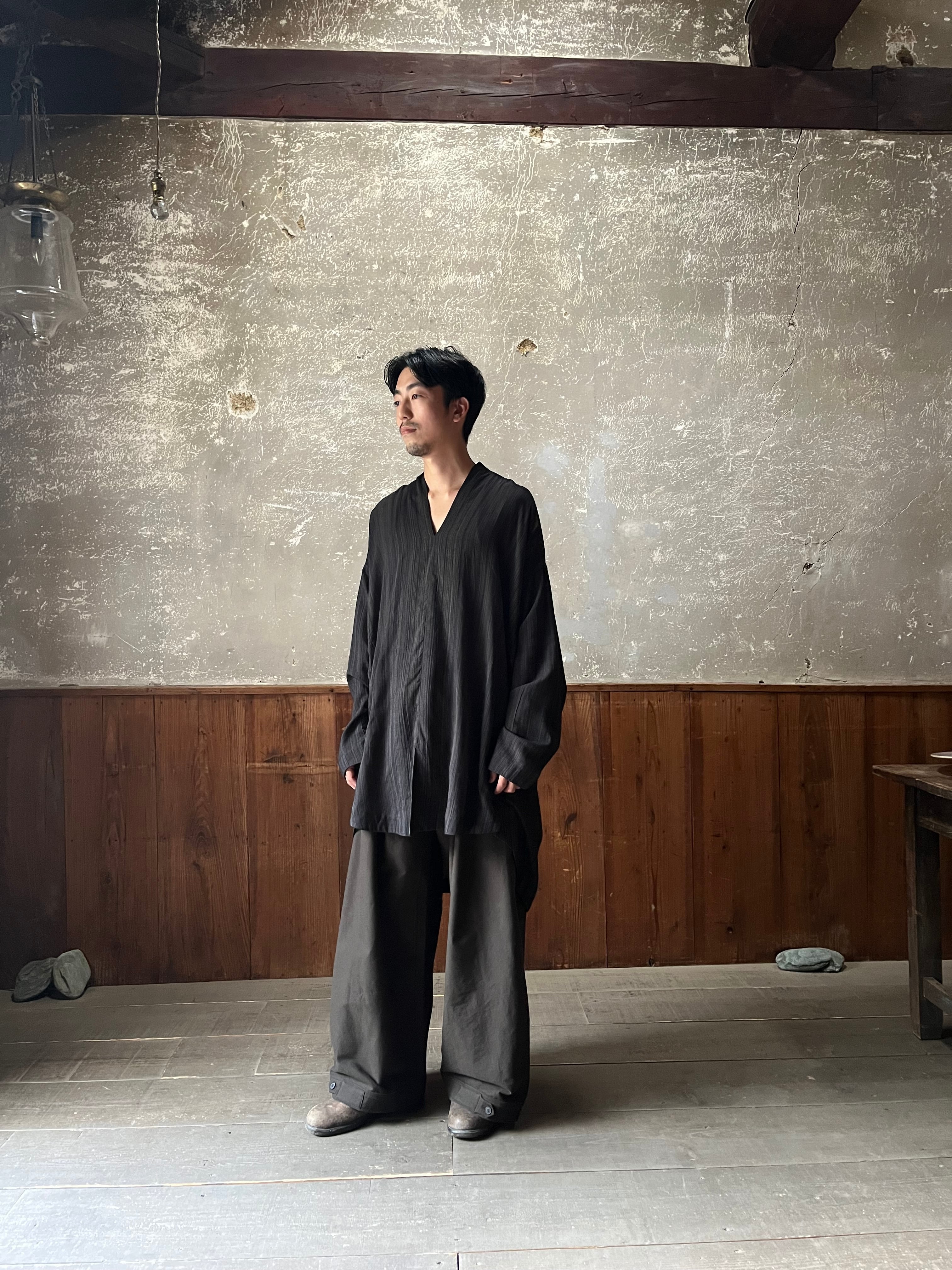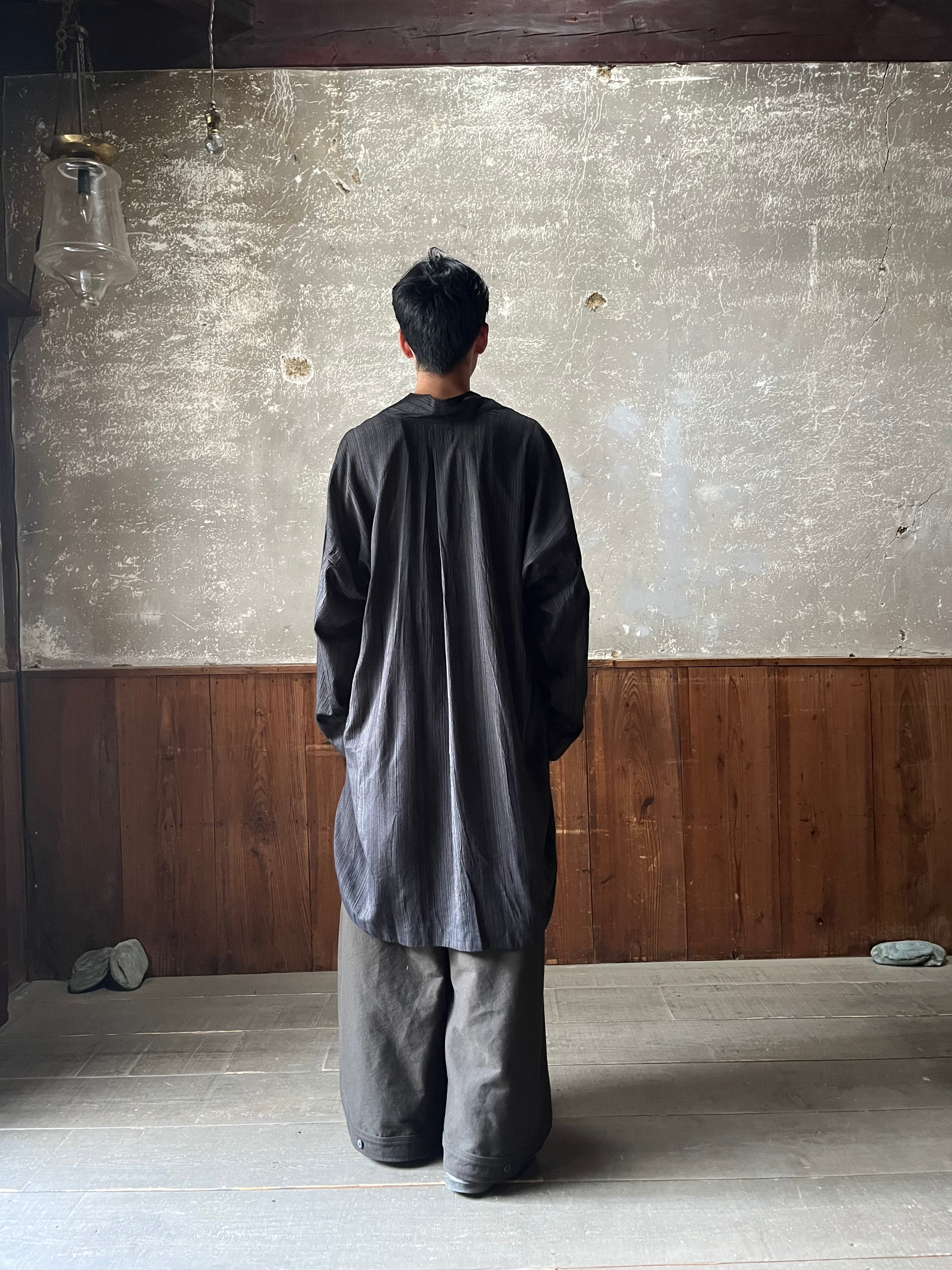 背中部分にはナイフプリーツが施された、きものカラーのルーズフィットチュニックです。