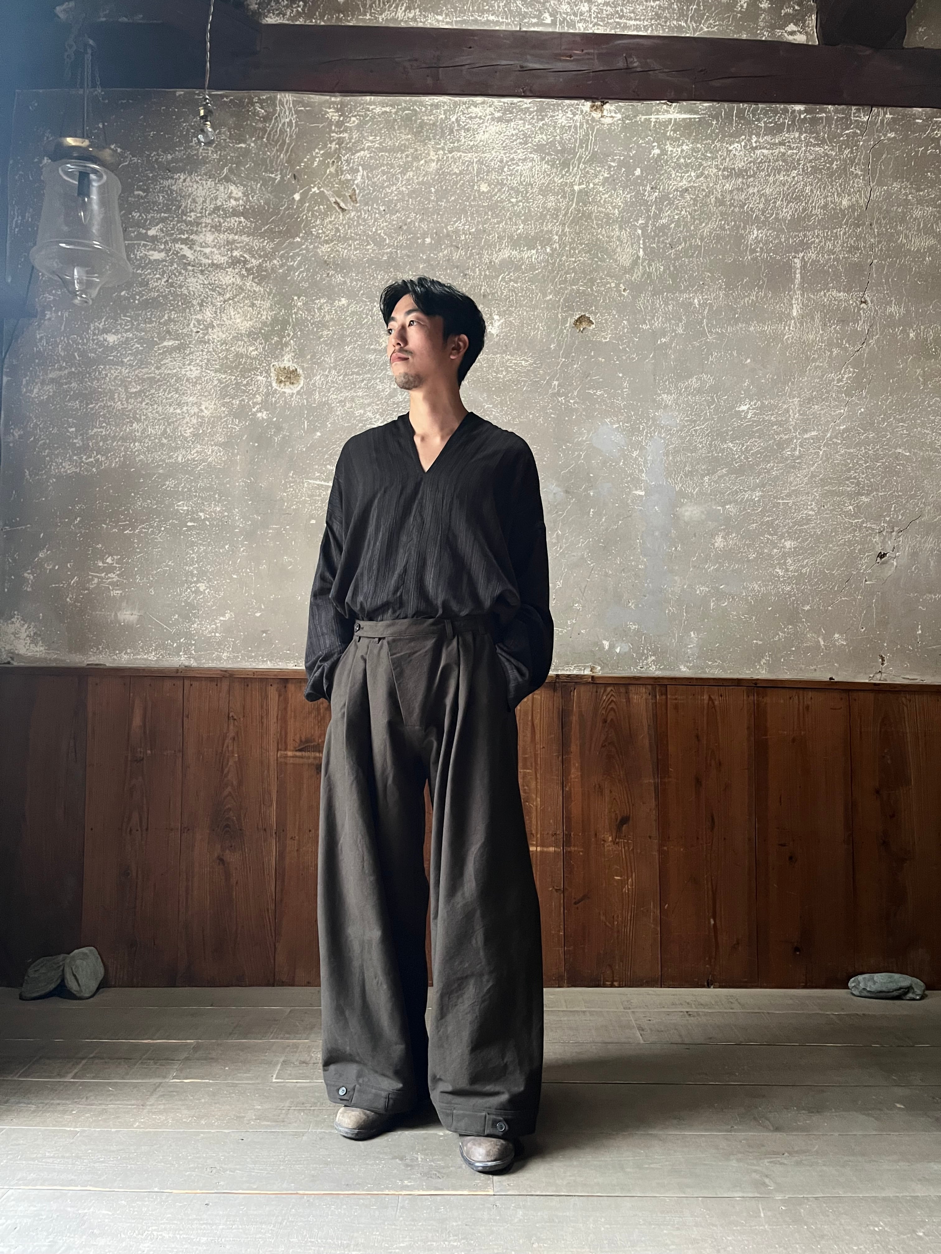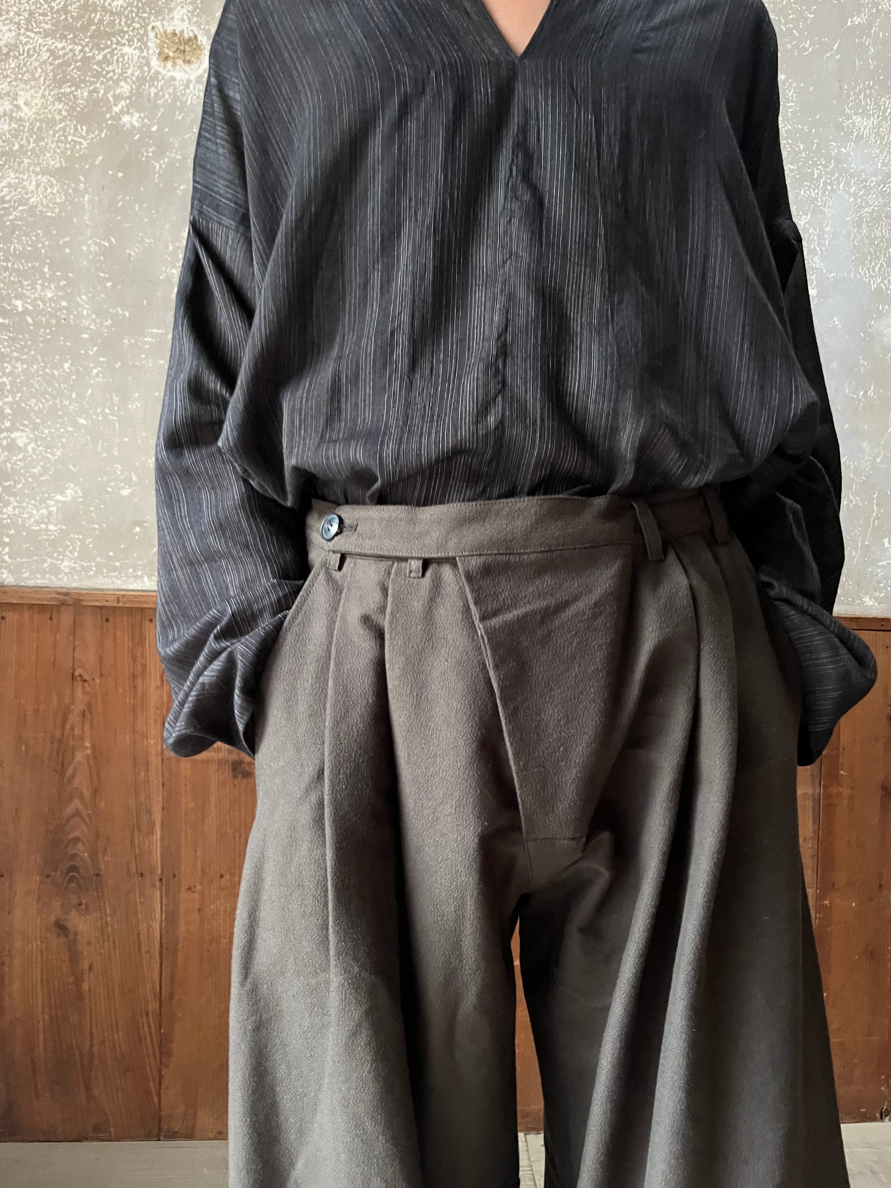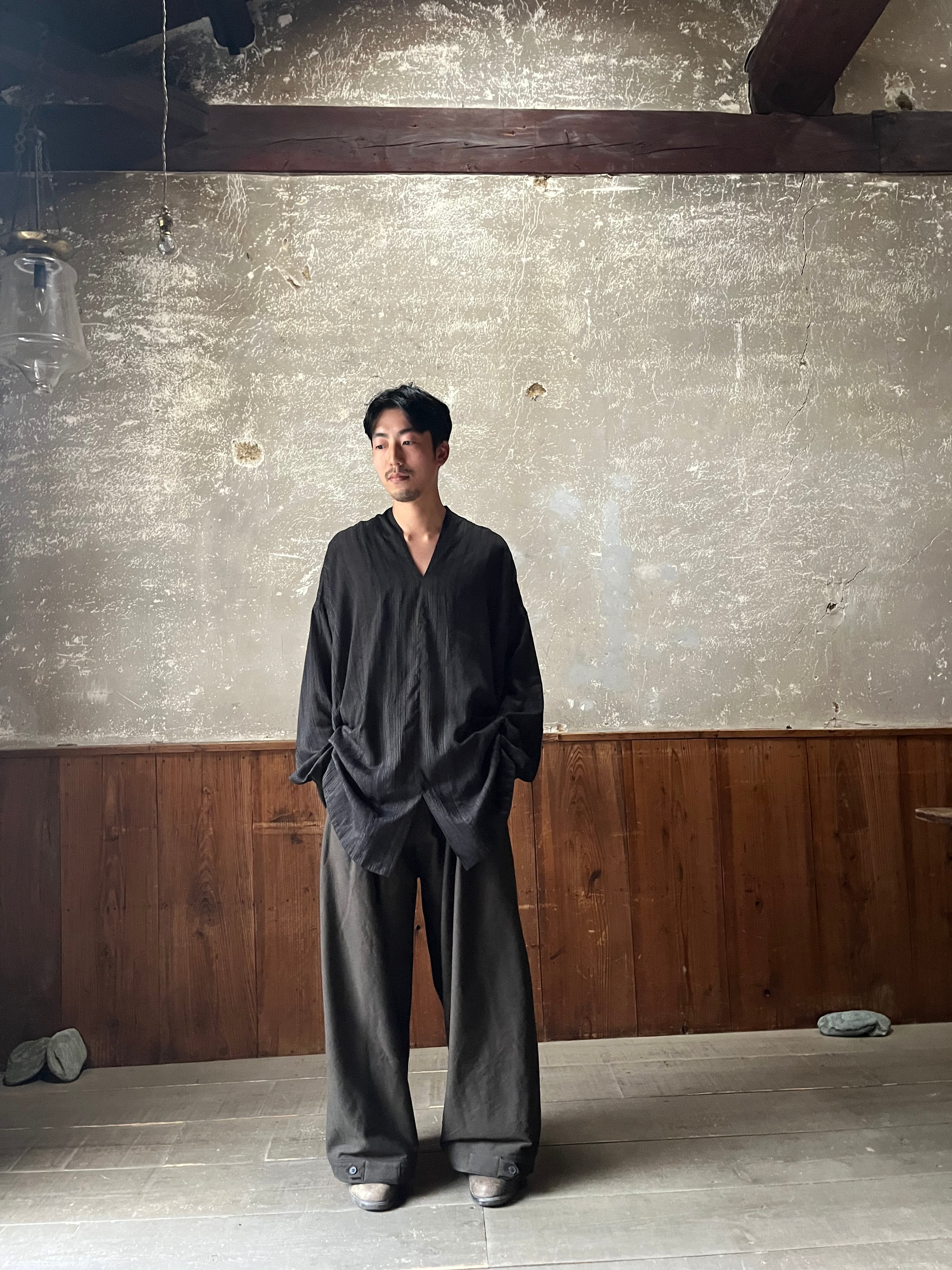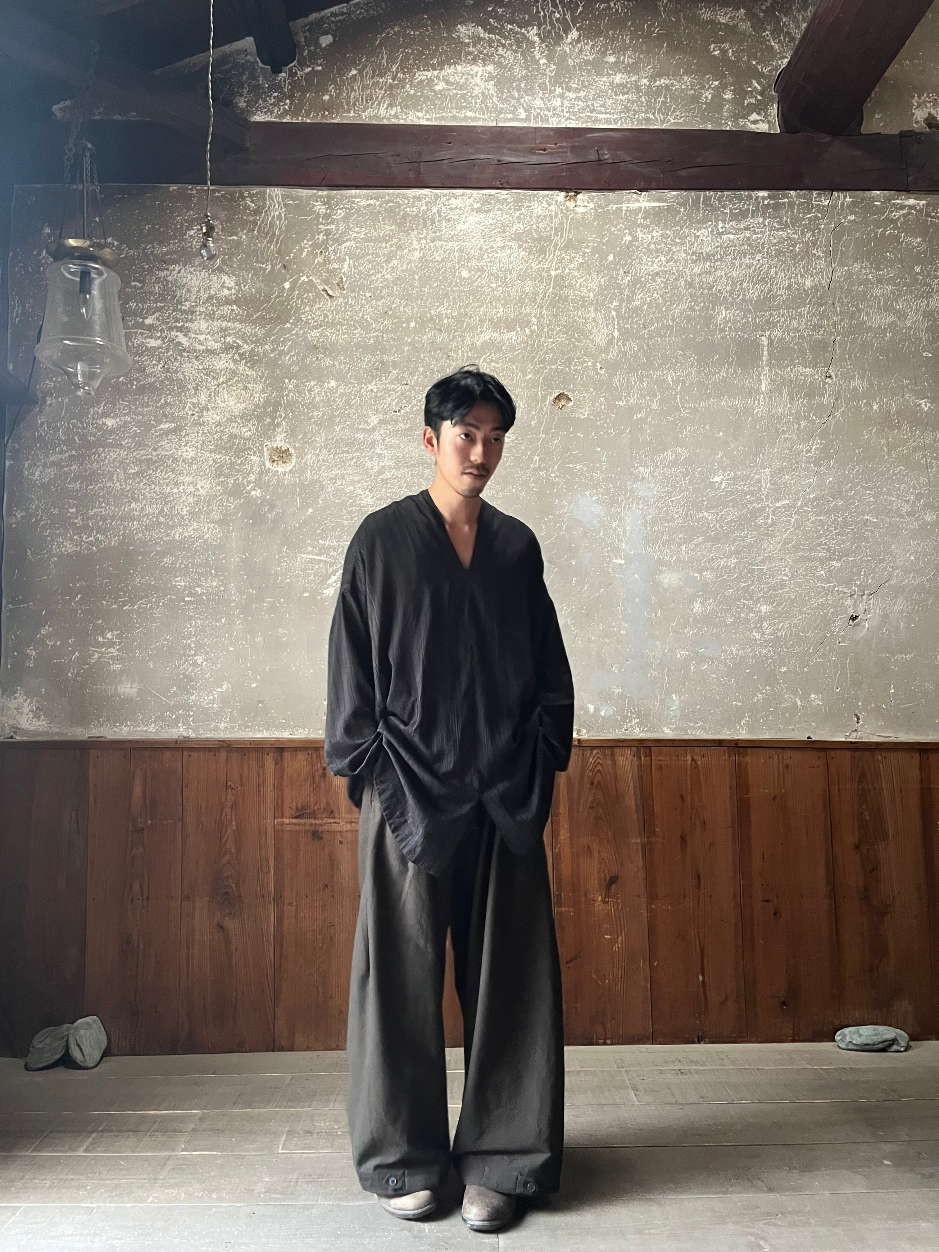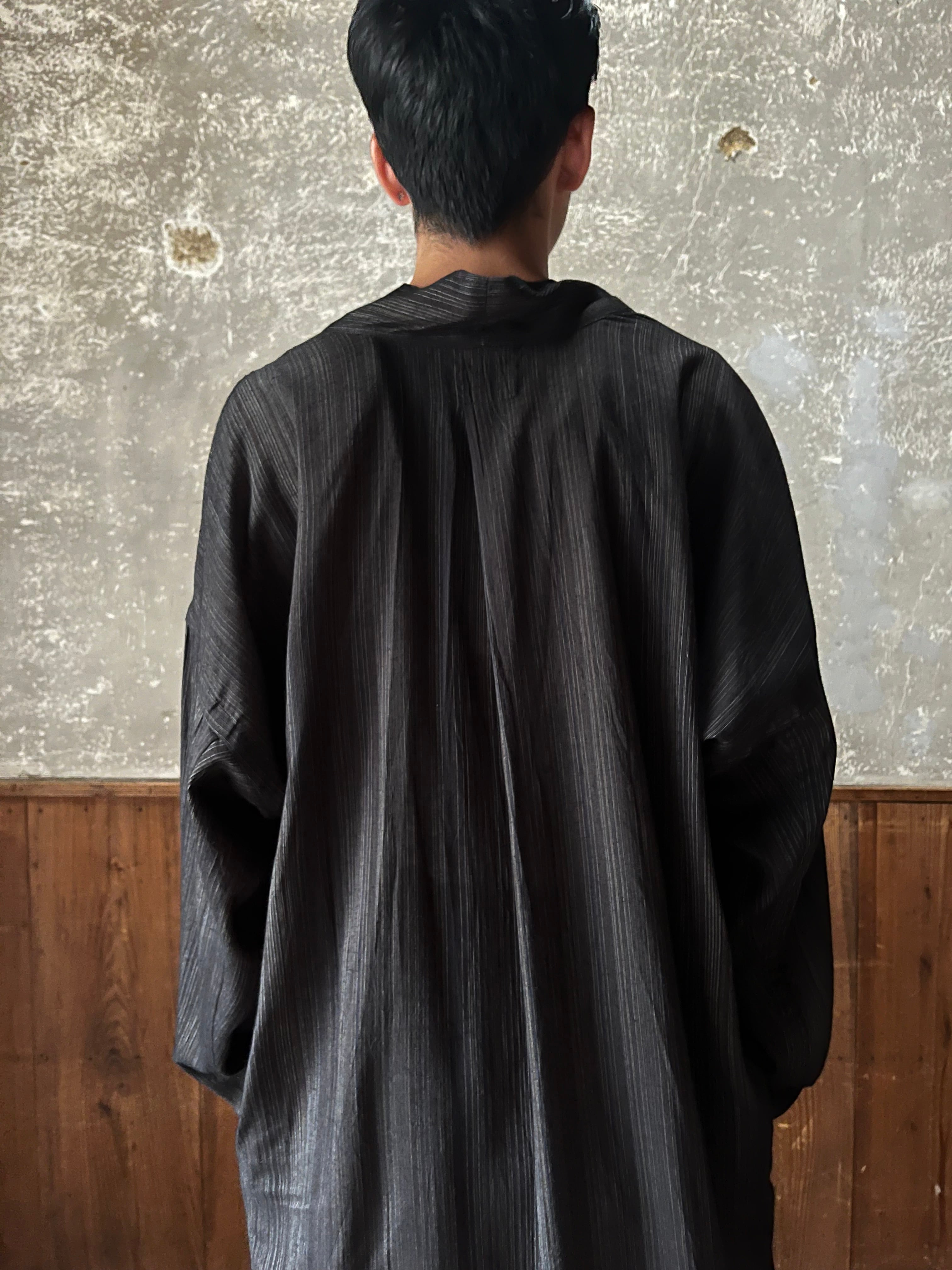 背中部分にはナイフプリーツが施された、きものカラーのルーズフィットチュニックです。