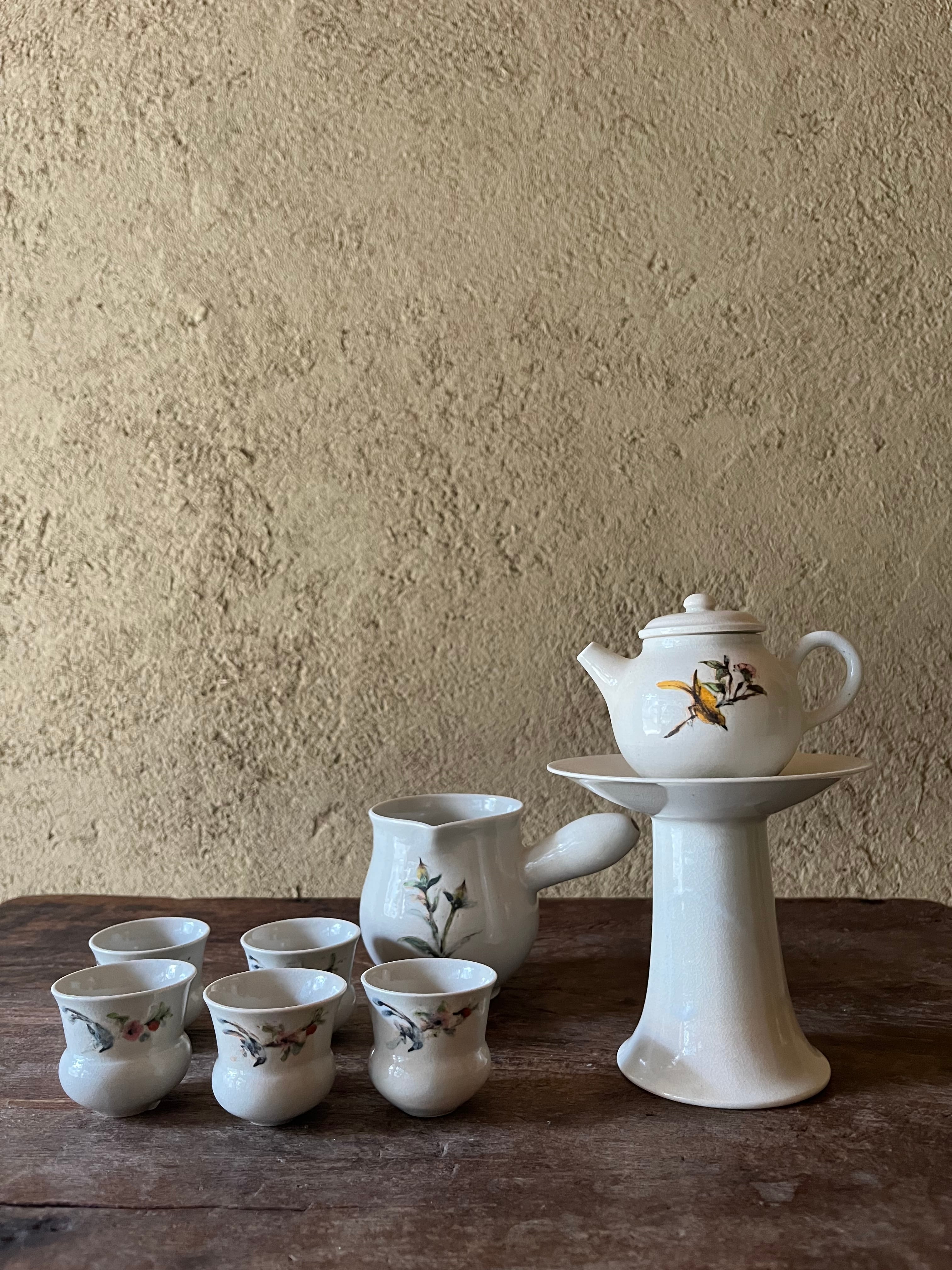黄色い小鳥が舞う、ふくよかな茶壺。
