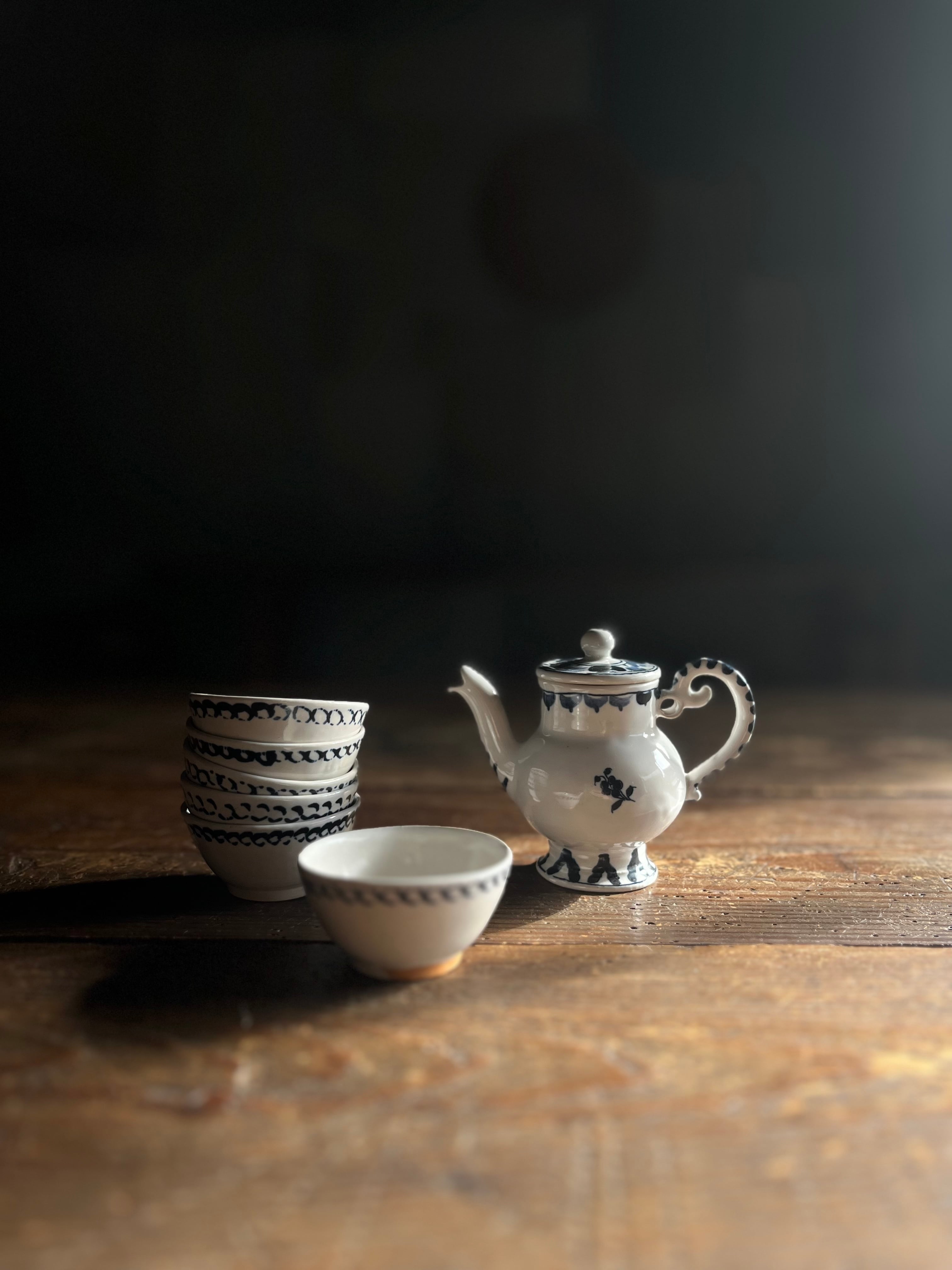 清々しい藍色で描かれた図案に、まあるいお腹。高台も魅力。